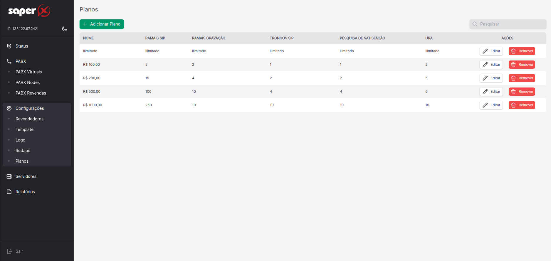 Neste módulo, o administrador define os parâmetros máximos que um PABX Virtual poderá utilizar. Os planos são frequentemente associados a pacotes comerciais, permitindo personalizar o serviço conforme a necessidade do cliente.
