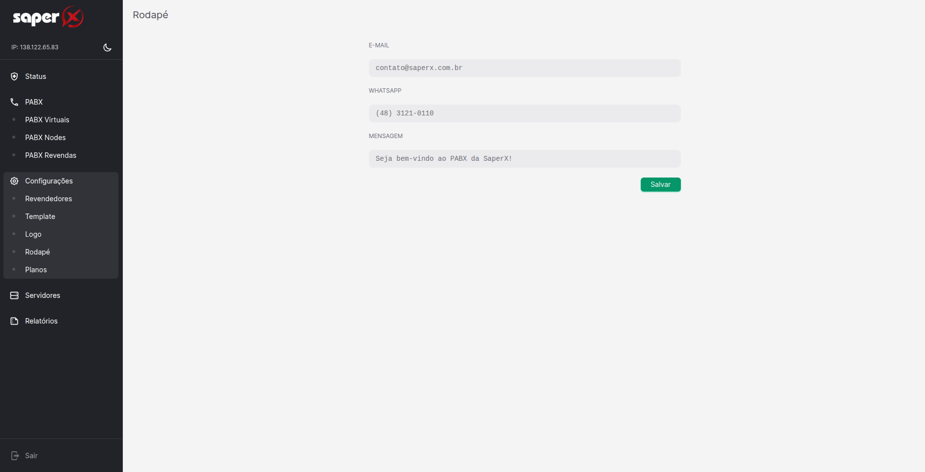 A página de Rodapé permite configurar informações de contato e uma mensagem personalizada que serão exibidas no rodapé do sistema. É uma forma prática de manter a comunicação e reforçar a identidade da empresa junto aos usuários.