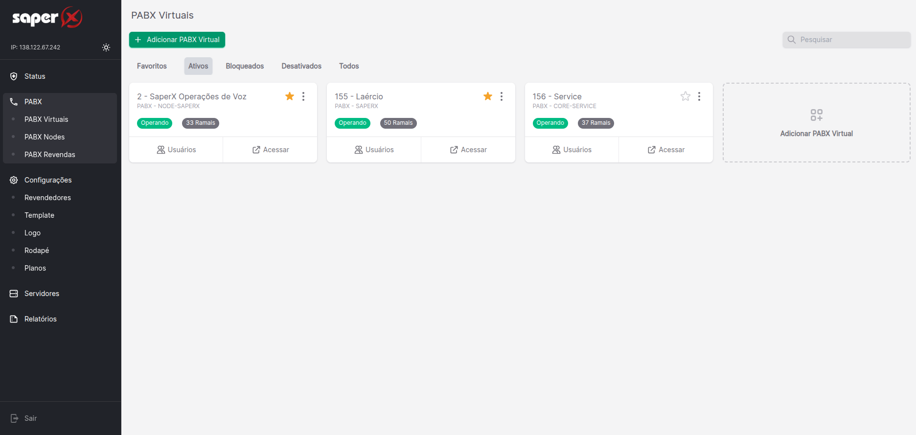 A página de PABX Virtuais permite aos administradores criar novas centrais PABX virtuais, gerenciar as existentes e organizá-las por status e preferências de acesso rápido.