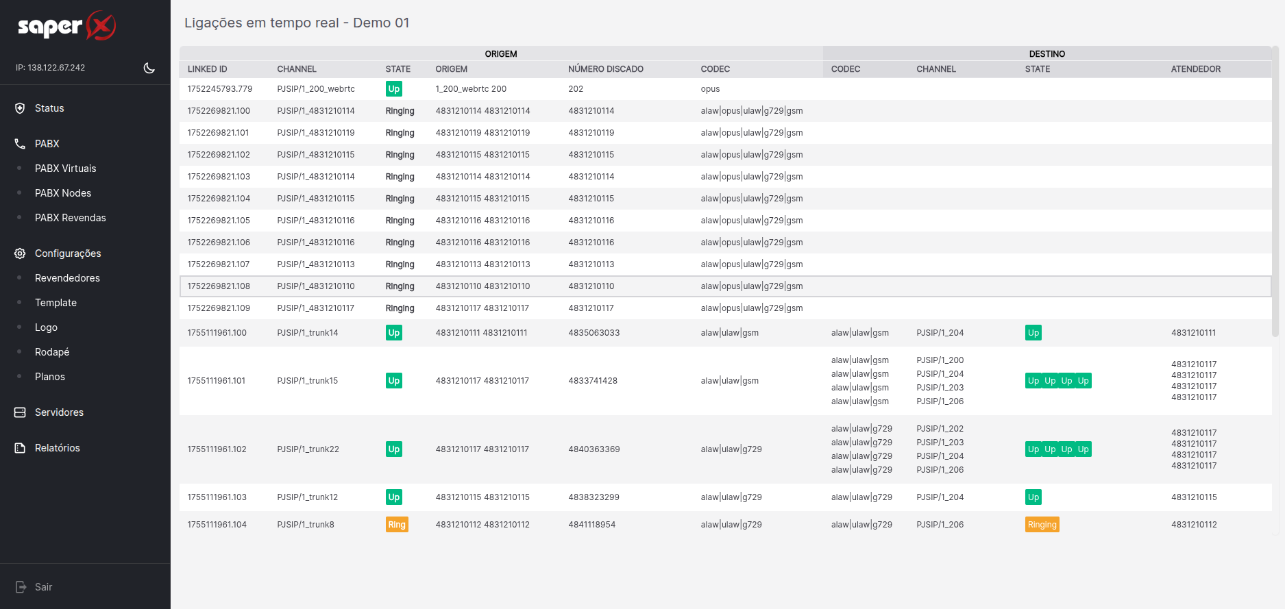 O módulo Ligações em Tempo Real permite acompanhar, de forma instantânea, todas as chamadas ativas no sistema, exibindo informações da origem e destino de cada ligação.