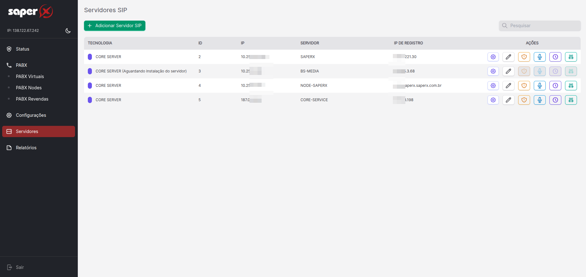 A página de Servidores SIP permite cadastrar e gerenciar todos os servidores SIP que compõem a topologia do produto. É aqui que cadastramos os servidores onde os PABX Virtuais serão hospedados, garantindo organização, escalabilidade e controle da infraestrutura.