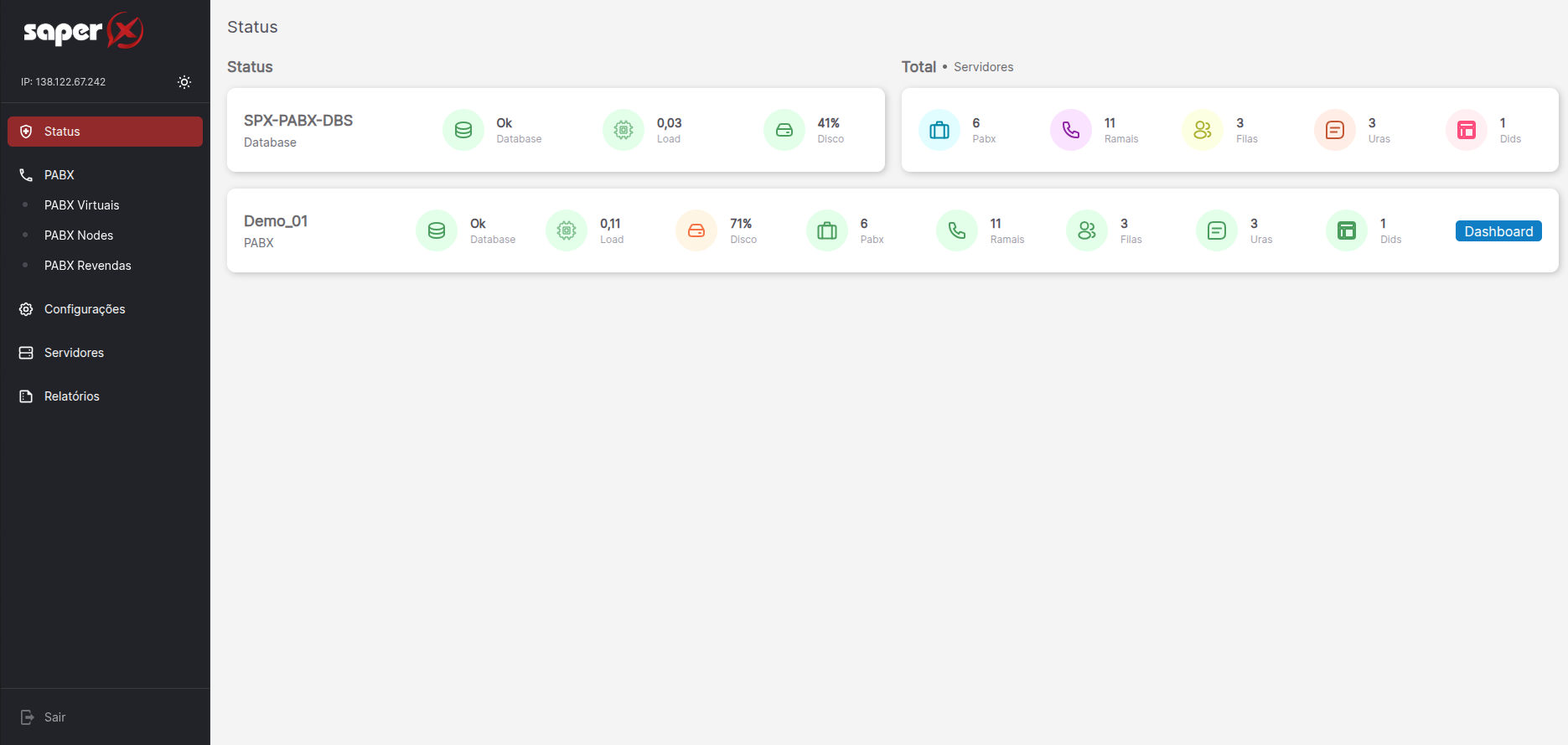 dashboard, status, servidores, PABX, SPX, monitoramento