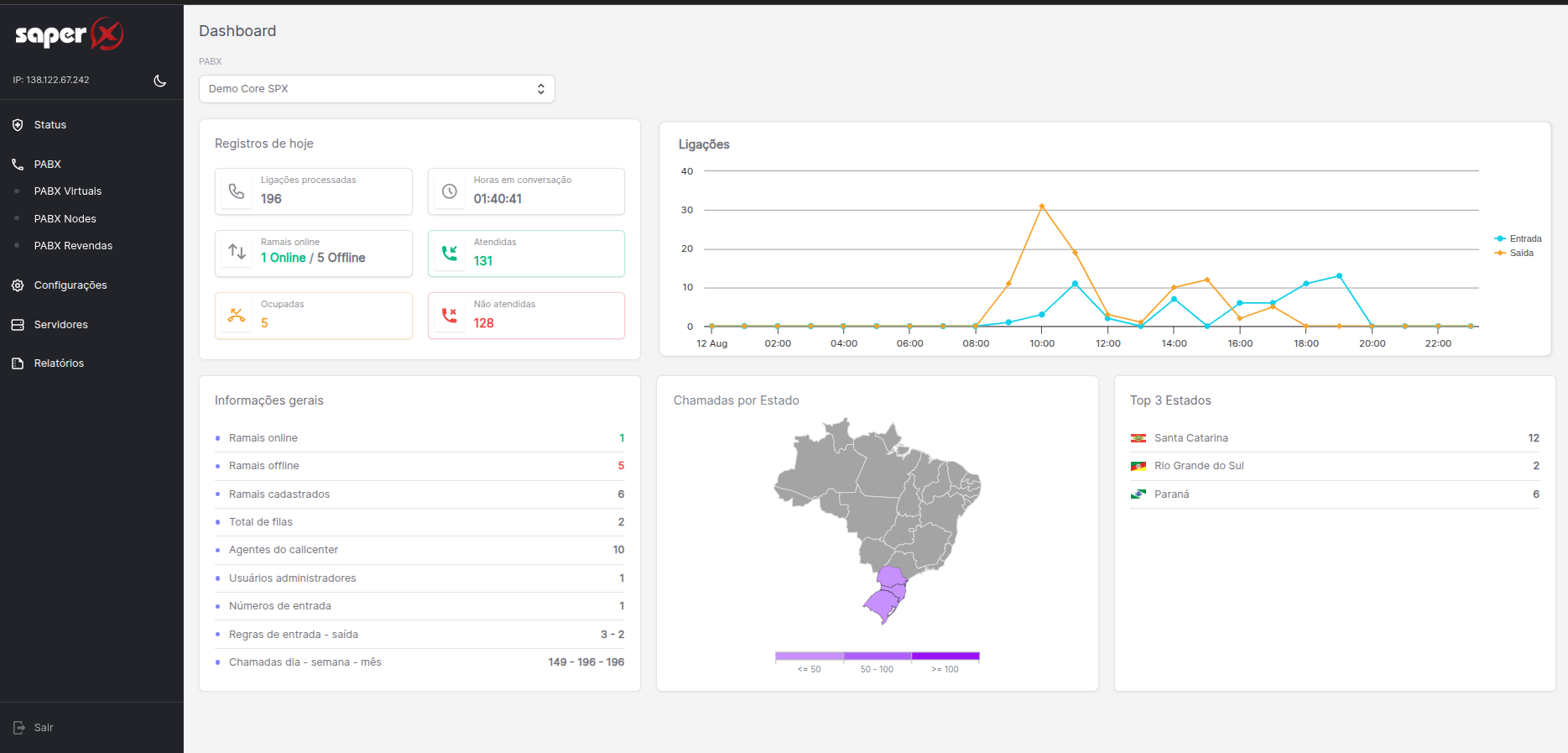 A página Dashboard exibe dados operacionais detalhados do servidor PABX selecionado, complementando a visão geral apresentada na tela de Status. Os dados são atualizados em tempo real e permitem avaliar desempenho, volume de chamadas e distribuição geográfica dos atendimentos.