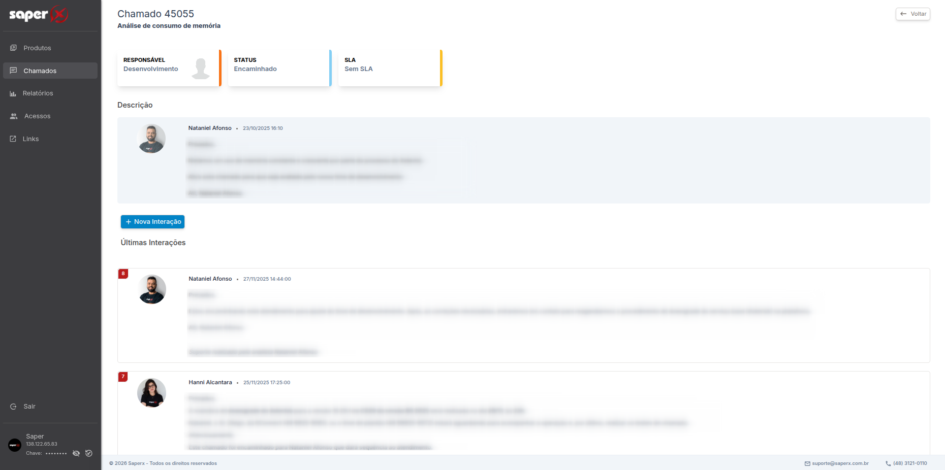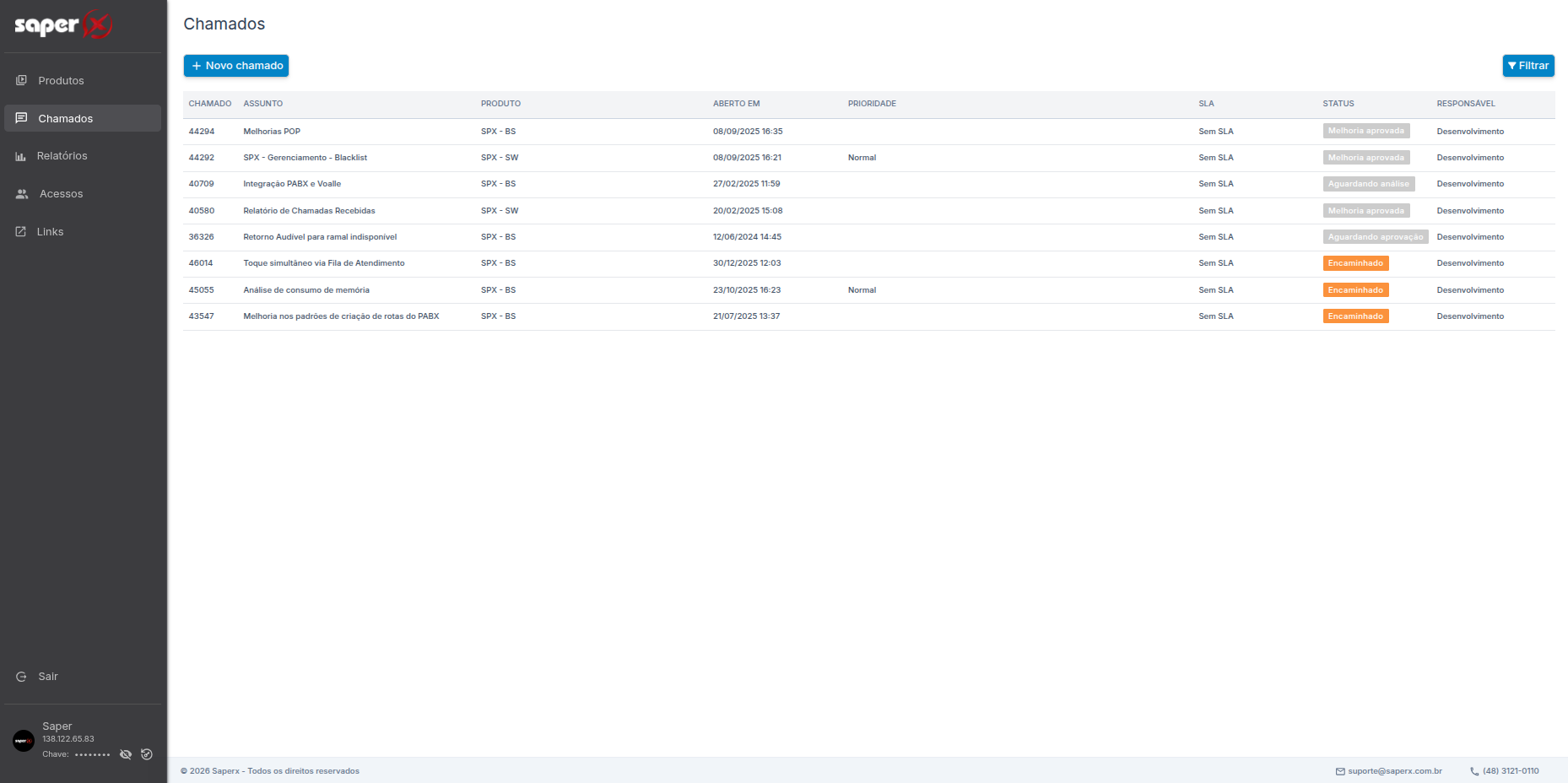 A funcionalidade Chamados permite que o administrador registre, acompanhe e interaja com solicitações junto ao time de suporte da SaperX. Por meio dela, é possível centralizar incidentes, dúvidas, solicitações técnicas e pedidos de melhoria relacionados aos produtos contratados.