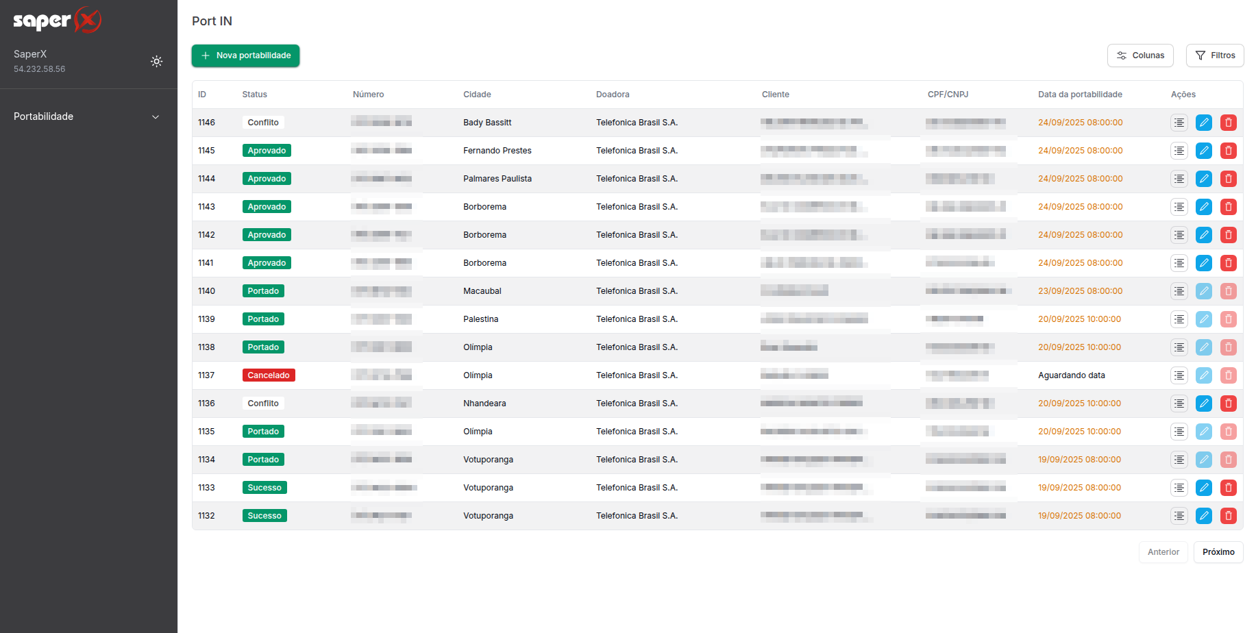 O módulo de Portabilidade automatiza todo o processo de migração de números. A partir deste painel é possível: