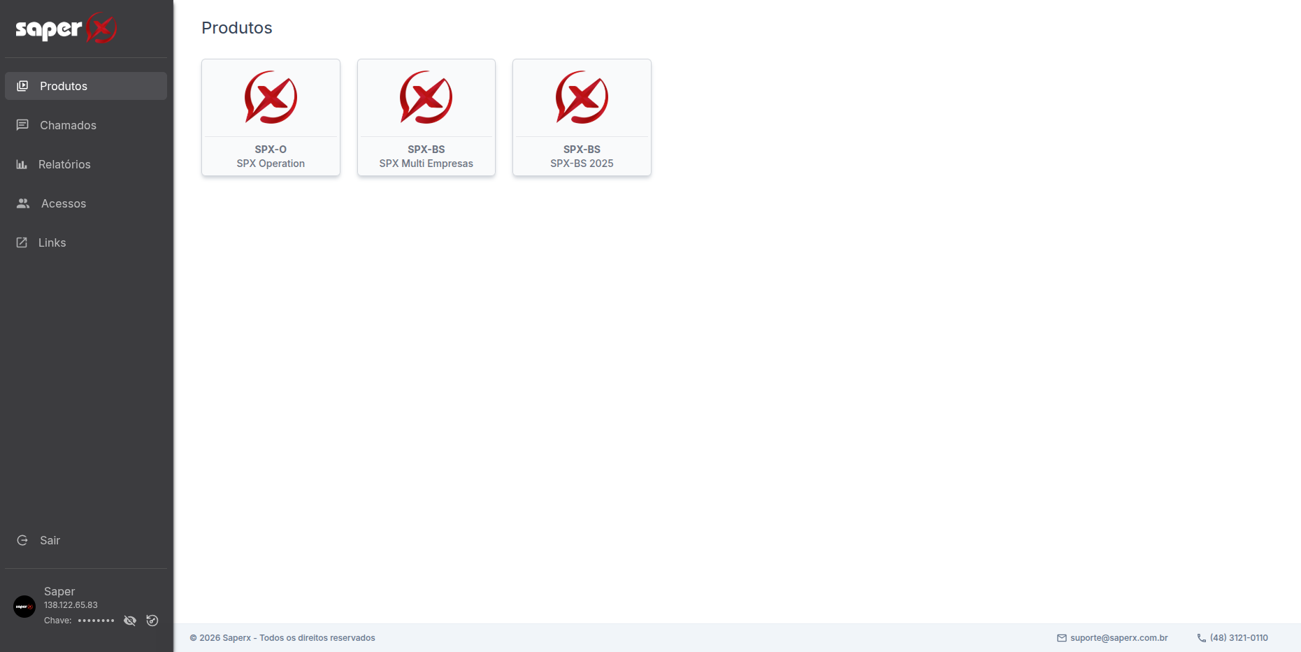 Ao clicar sobre um dos produtos, o usuário será redirecionado para o painel de controle principal correspondente, já autenticado e com suas permissões aplicadas.