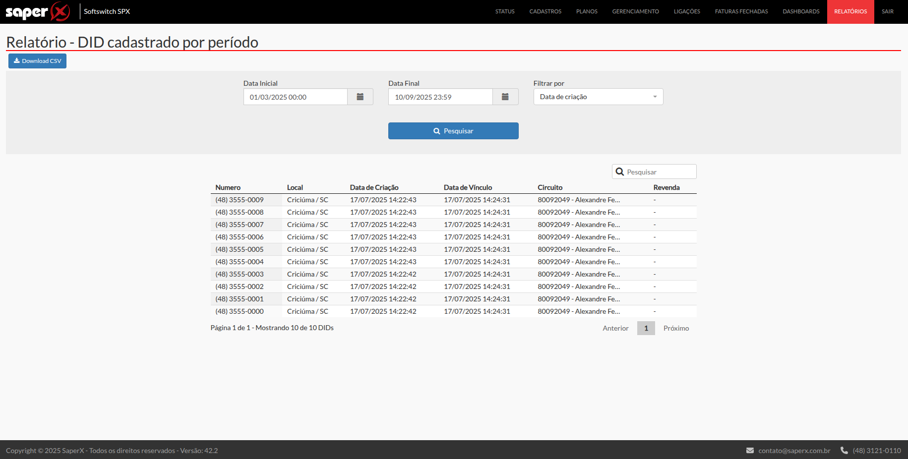 O relatório de DIDs Cadastrados por Período tem como objetivo apresentar todos os números cadastrados na plataforma dentro de um intervalo de tempo definido.
